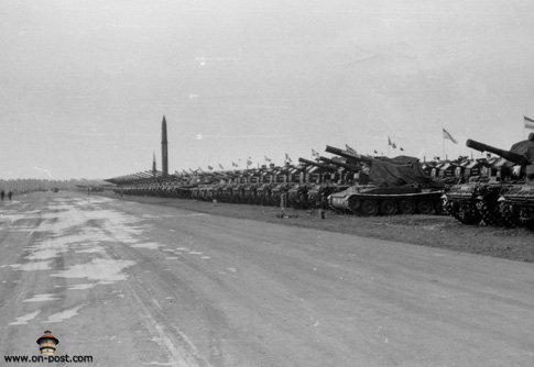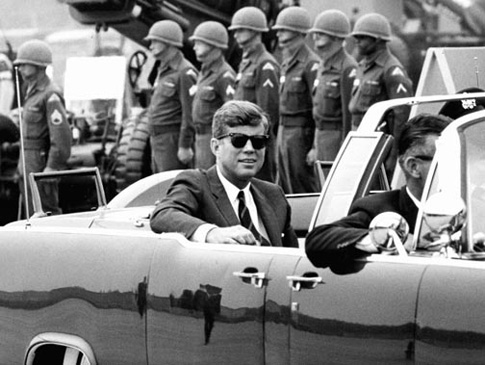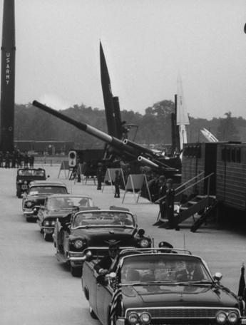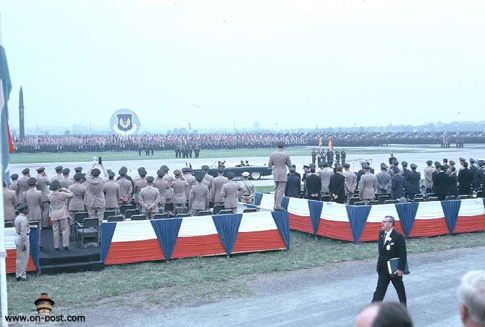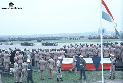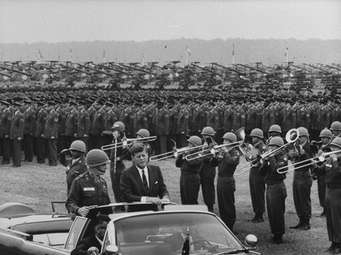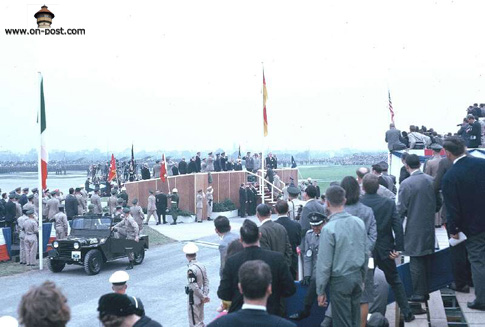 President Kennedy in lead limousine reviews a massive formation of 3rd Armored Division. Seventh Army and V Corps Artillery troops at Fliegerhorst Kaserne & Army Airfield.