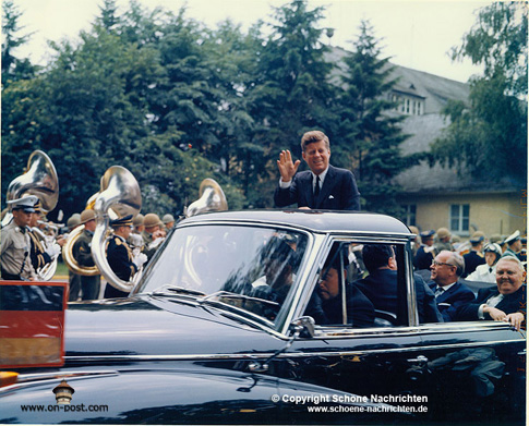 president and received a big thank you. A jubilant German-American crowd greeted Kennedy when his helicopter landed punctually at 10:30 a.m. on June 25. "There was raving enthusiasm, something you can't imagine today," said Bayer, who was 15 at the time. "Kennedy was a symbol for the young generation. He was our bearer of hope. He took the sympathy of the Germans by storm and won their hearts," Bayer said. Kennedy's youthful aura, which clearly set him apart from Germany's Chancellor Konrad Adenauer, who had been in office since 1949, was also appealing. "He also proved his courage during the Cuban [missile] Crisis. That left a strong impression with the Germans. He was so strong and upright that we had unlimited confidence in him," Bayer said. "When I think about it, it still gives me goose bumps. He was such an awesome guy," he added after a pause. Kennedy started his visit by inspecting the honor guard made up of American, Canadian, German and French soldiers. The four national anthems were played, and Maj. Gen. John R. Pugh, 3rd AD commander and Kennedy's escort on that day, reviewed the mile-long parade front. Then the president addressed the troops, thanking them for their engagement. "Never before in history has a country had so many of its sons serving so far away from their own land in a time of danger, not for the purpose of conquest, but for the purpose of freedom." After an inspection of a static display including tanks, missiles, engineer equipment, aircraft and helicopters, the president went to the 54th Transportation Battalion mess hall and dined with over 300 soldiers and airmen. The Hanauer Anzeiger newspaper of June 26, 1963, observed that the president drank from a plastic cup just like all the soldiers did, and he enjoyed it. At 2 p.m. Kennedy left Fliegerhorst in a big black Mercedes convertible on his way to a reception in Frankfurt, accompanied by German Vice Chancellor Ludwig Erhard. "All the 20 kilometers from Fliegerhorst to Frankfurt people were lined up at both sides of the road," said Bayer. "All who could walk were out there. It must have been hundreds of thousands, an entire generation." Holger Lutzen of the Hanau Legal Center also has vivid memories of seeing the American president from his position on the shoulders of his father as a little boy. "I was there in Frankfurt and I clearly remember the endless crowd of people." The euphoric atmosphere lasted several weeks. "After